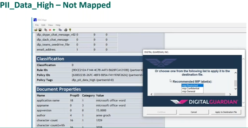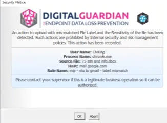 - DG can enforce rules when labels mismatch, e.g., "Public" files leaving via Gmail.
