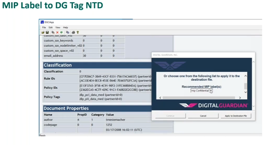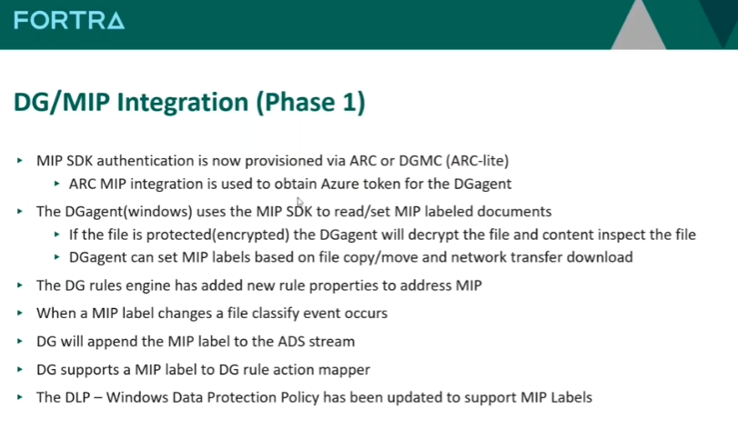 DG agents gained the ability to inspect MIP-protected files, decrypt them securely using SDK authentication, and classify or control them without breaking encryption. This closed a major DLP visibility gap into protected content:
