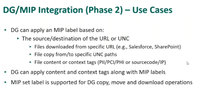 - DG can read, decrypt, and inspect MIP-protected content without breaking encryption.