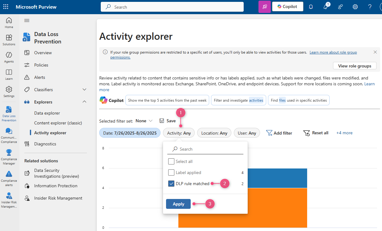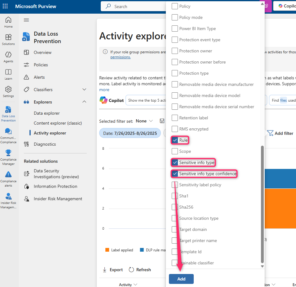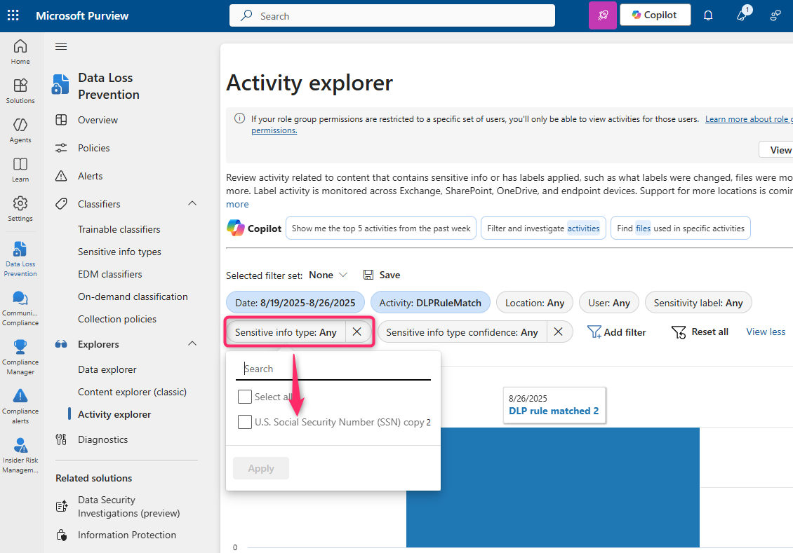 Now select "DLP rule matched" in the Activity filter, and click on one of our triggered SITs from the "Sensitive info type" filter: