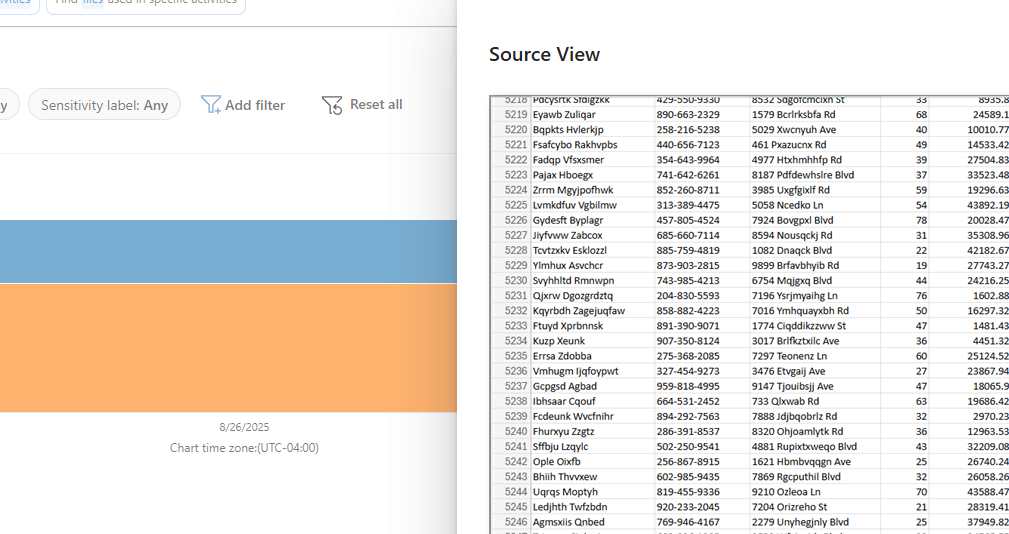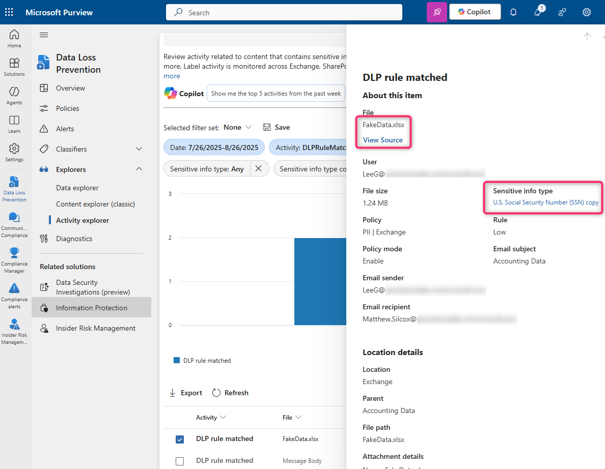 Pick a hit from the table, and you'll get the "DLP rule matched" flyout for it. The two most useful options here will be the "View Source" link and the "Sensitive info type" link: