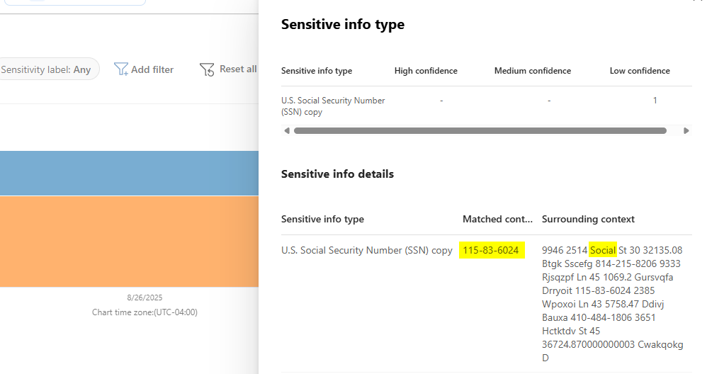 This is where the aforementioned "Sensitive info type" viewer comes into play. It's actually very common in my practice to have to tell people to click on the SIT hyperlink to see the contextual match. The assumption seems to be that the "DLP rule matched" card is just telling you which SIT triggered. Check it out: