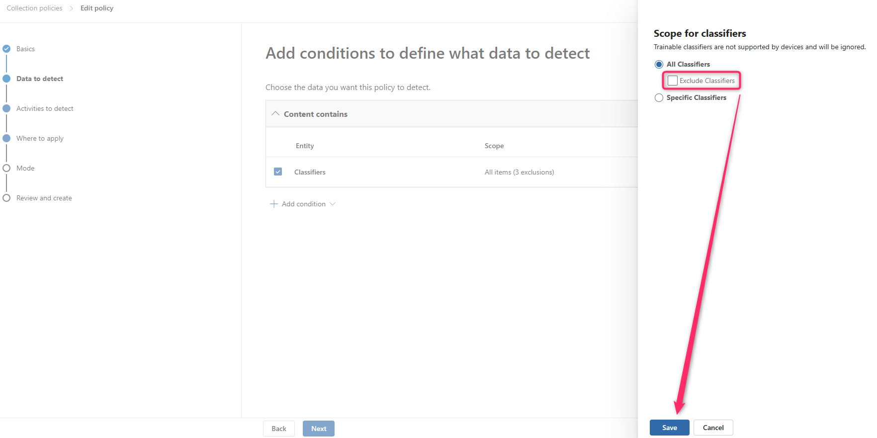 - Step-through the policy wizard until you get to "Data to detect".