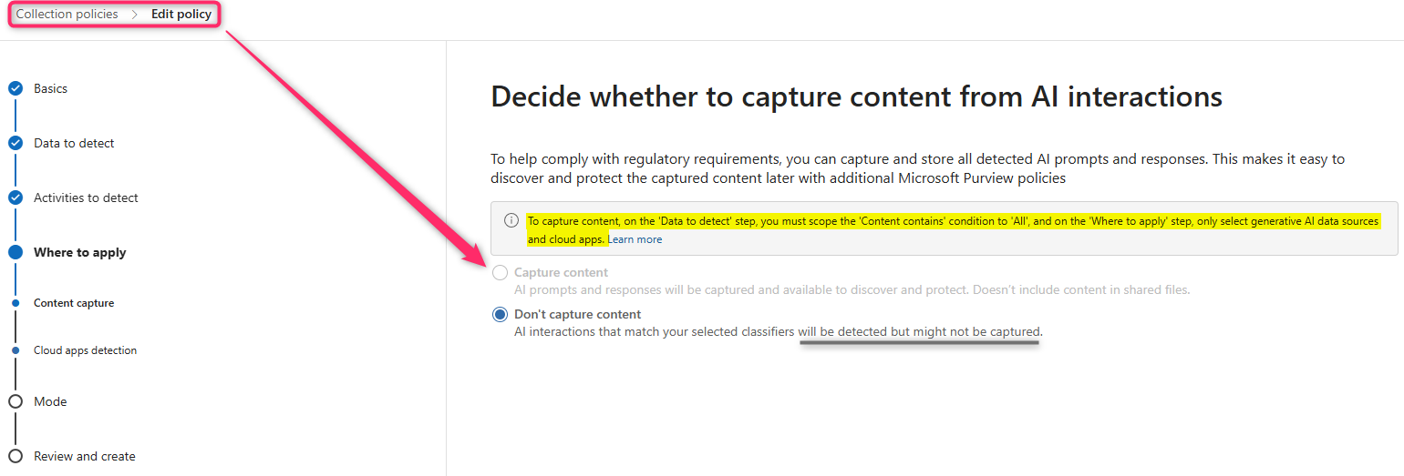 Turning on DSPM for AI’s one-click policies gets your dashboards populated, but it doesn't guarantee prompt and response bodies in Activity Explorer. Without a specific edit, you'll mostly see headers, counts, and detections (not the text you need).