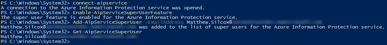 - To verify these steps worked, run Get-AIPServiceSuperUser.